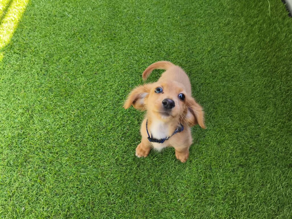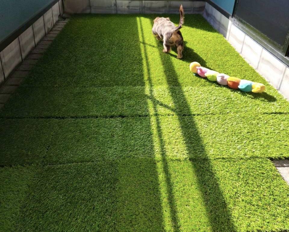 そばといなりが、ベランダで遊べるようにDAISOさんの人工芝を敷いてみました。