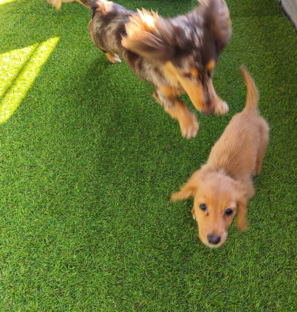 もう1枚は、そばがジャンプしながら走り回り、いなりはマイペースに探索をしている様子です。